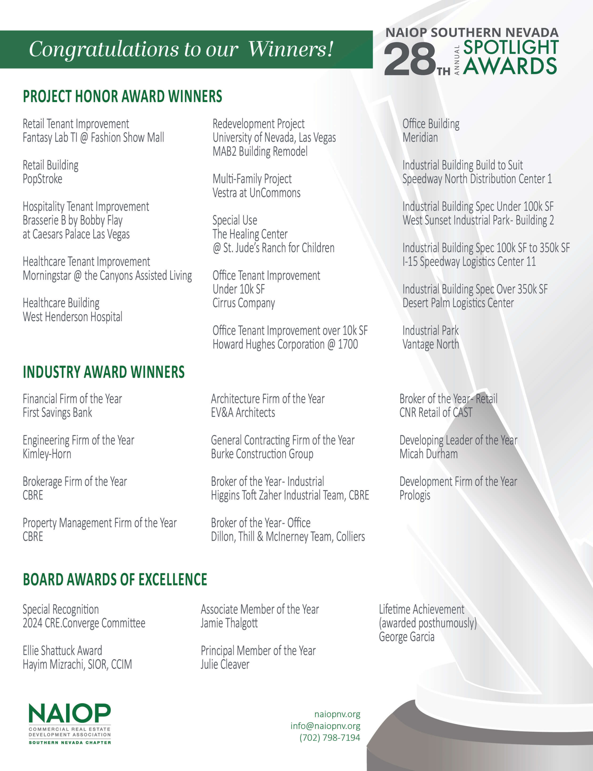 Thank you to everyone who contributed to the program, whether as an attendee, judge, nominee, honoree, board member, committee member, etc. You help deliver the excellence that is NAIOP Southern Nevada!